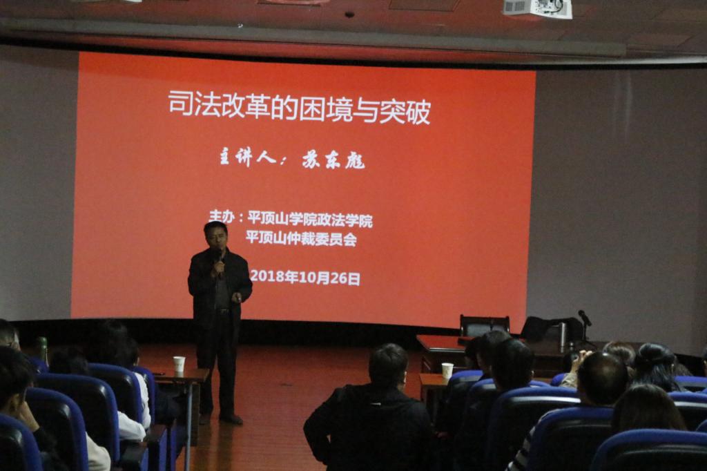 10月26号下午,平顶山仲裁委员会与公司联合举办的“司法改革的困境与突破”主题的讲座在2106教室开展。讲座由平顶山仲裁委委员、平顶山市律协副会长苏东彪主讲,365英国上市公司经理徐双喜出席讲座并致开幕词,365英国上市公司全体同学一同聆听了此次讲座。
