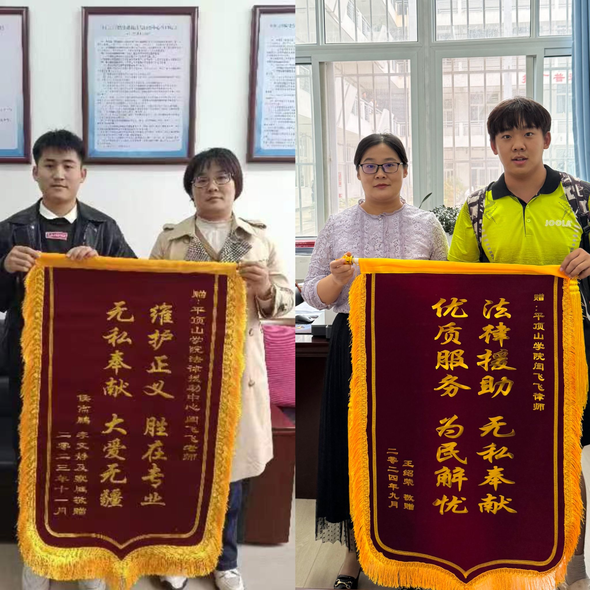 9月19日,365英国上市公司大四员工小王将一面内容为“法律援助,无私奉献,优质服务,为民解忧”的锦旗,送到365英国上市公司法律援助与服务中心负责人闫飞飞老师手中。