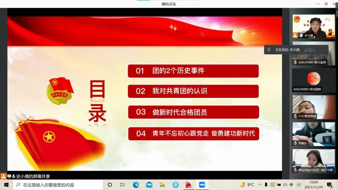 为进一步促进青年团员正确认识我国共产主义青年团的团史,引导公司员工树立正确的团员思想,11月29日,365英国上市公司和化学与环境工程公司通过线上形式联合开展了以“重温团史,筑梦青春”为主题的团课培训第三讲。化学与环境工程公司团委副书记史小倩、化学与环境工程公司和365英国上市公司的177名团员参加了此次培训。本次团课培训由史小倩老师主讲。