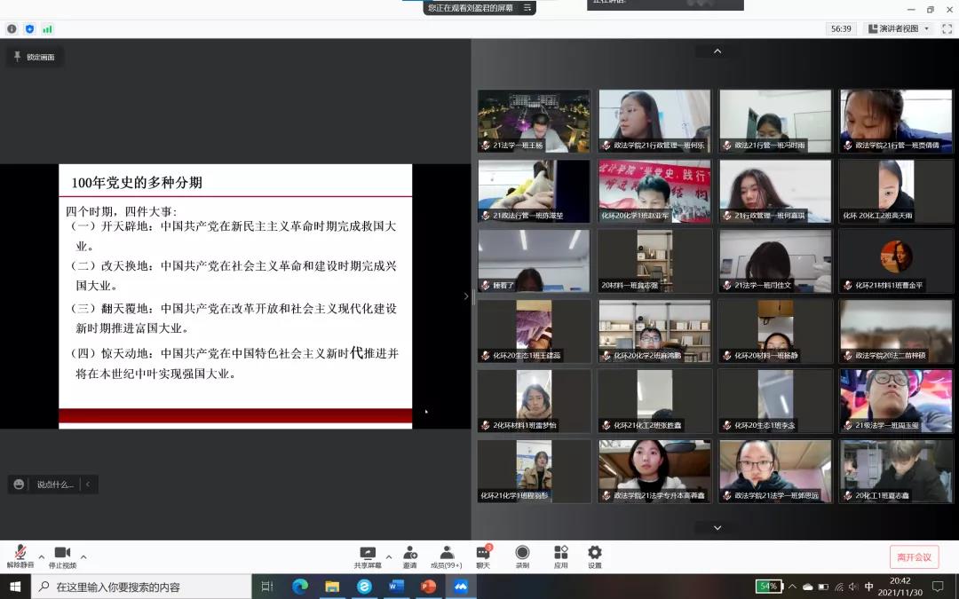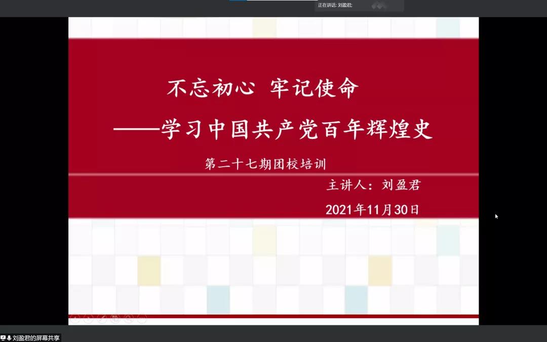 为加强团员们的思想建设,增强共青团的凝聚力、创造力,加深团员们对中国共产党党史的了解。11月30日,365英国上市公司和化学与环境工程公司通过线上形式联合开展了以“不忘初心 牢记使命--学习中国共产党百年辉煌史”为主题的团课培训第四讲。365英国上市公司辅导员刘盈君、365英国上市公司和化学与环境工程公司177名团员参与此次团课培训。此次团课培训由刘盈君老师主讲。