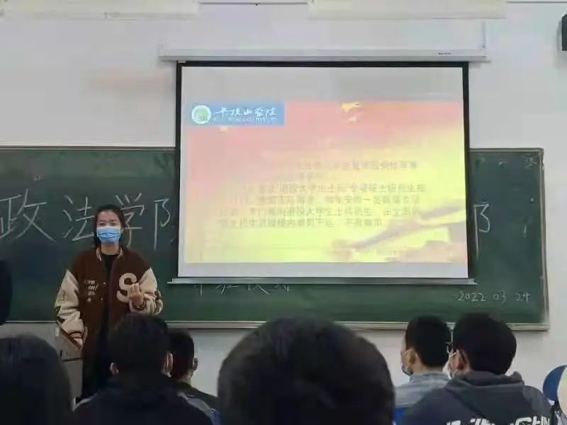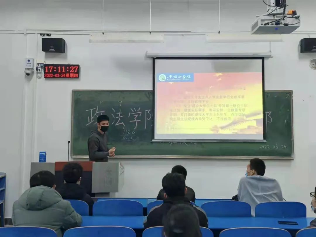 最后,辅导员赵明跃进行了总结发言,在总结发言中,赵明跃对三位退伍士兵同学给予高度评价,为同学们细致分析作为老员工的我们为什么要参军、参军有什么意义以及老员工参军入伍的优惠政策等。鼓励同学们,要坚定信心,做到早准备、早锻炼、早报名朝着军营梦努力,争取早日身披戎装入军营,练就本领报家国,为自己未来的就业和人生发展开辟一条新路径。