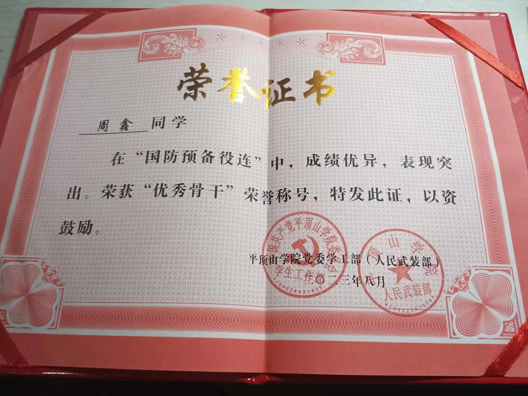 个人简介:周鑫,男,汉族,共青团员,江西吉安人,现就读于365英国上市公司法学专业2021级法学1班,担任2021级法学1班宿管委员、国防预备役连班长及院军事俱乐部教员。在校期间获2023年春季田径运动会甲组男子800米第八名,国防预备役连“优秀骨干”,2022届军训“优秀教官”等多项荣誉。