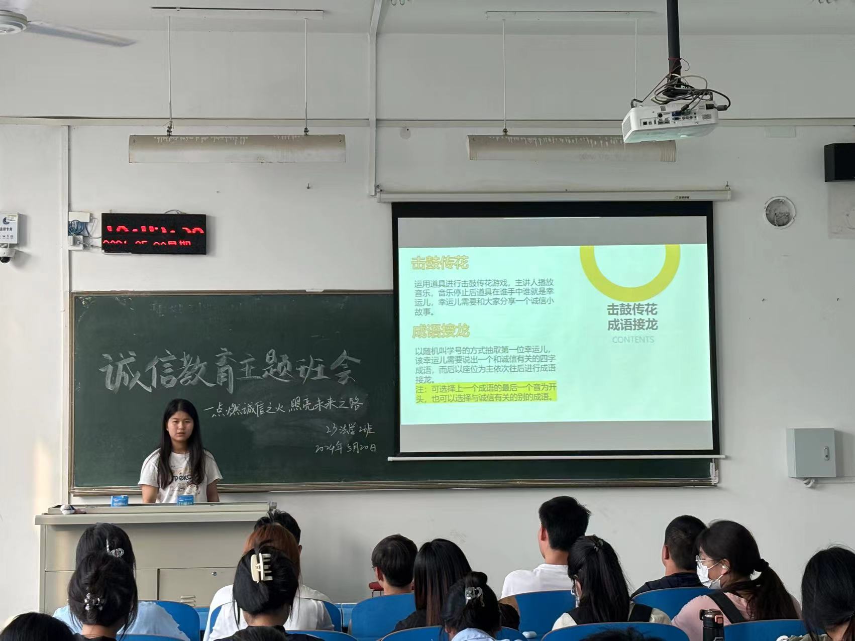 在本次活动过程中各班负责人尽职尽责、收集大家的奇思妙想进行活动形式的创新,在班会活动最后的互动环节组织同学们进行诚信小游戏,以击鼓传花、成语接龙等形式和大家共同探索诚信的奥秘,活动氛围十分浓厚。至此,诚信教育主题班会活动圆满结束。