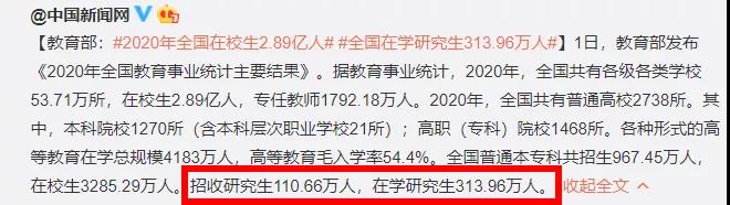 据统计显示,2020年招收研究生110.66万人,在学研究生313.96万人。