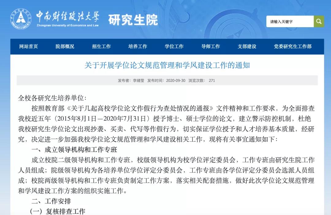 中南财经政法大学发布《关于开展学位论文规范管理和学风建设工作的通知》,