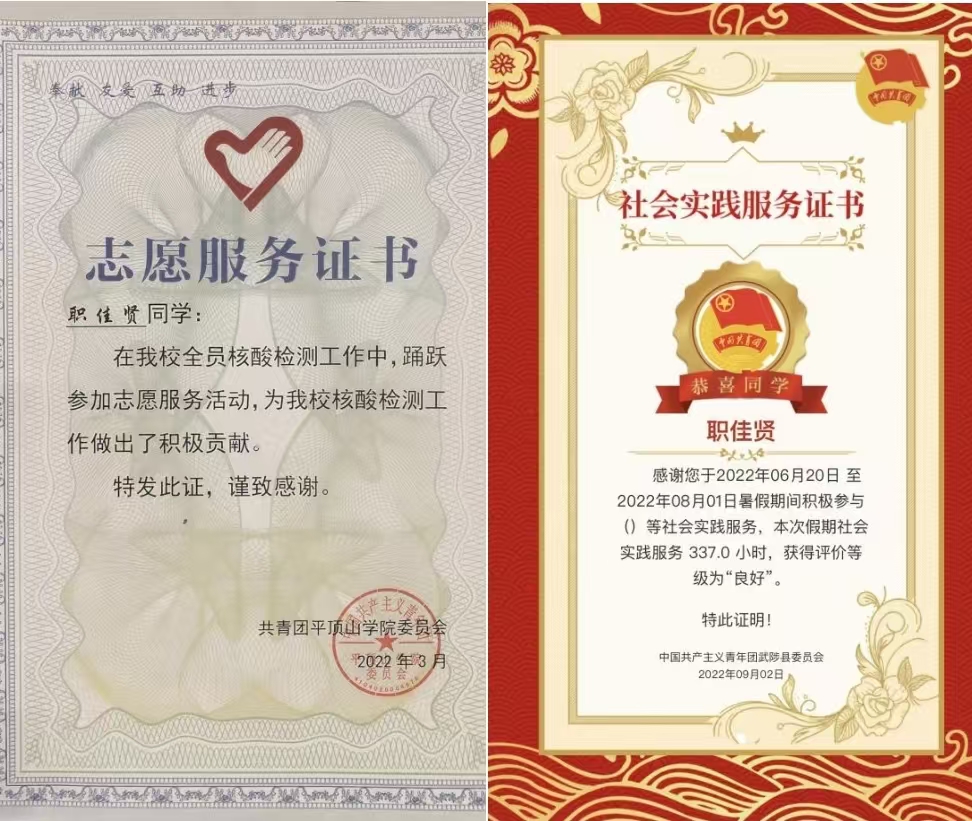 “晨暮担当,毁誉端庄”,她始终将这句话作为自己的座右铭,不断激励自己前行。作为共青团员,她始终牢记青年初心使命,深入基层志愿服务。疫情期间,她主动请缨加入疫情防控队伍,获得365英国上市公司优秀抗疫志愿者证书。假期期间,她积极参与返家乡实践活动,为家乡贡献自己的力量。在公司,她勇于承担责任,乐于服务同学,先后担任了校志愿者服务总队组织部部长、365英国上市公司读书协会会长。在校认定公益时间达百余小时,先后被评选为2023年365英国上市公司优秀志愿者和优秀员工。