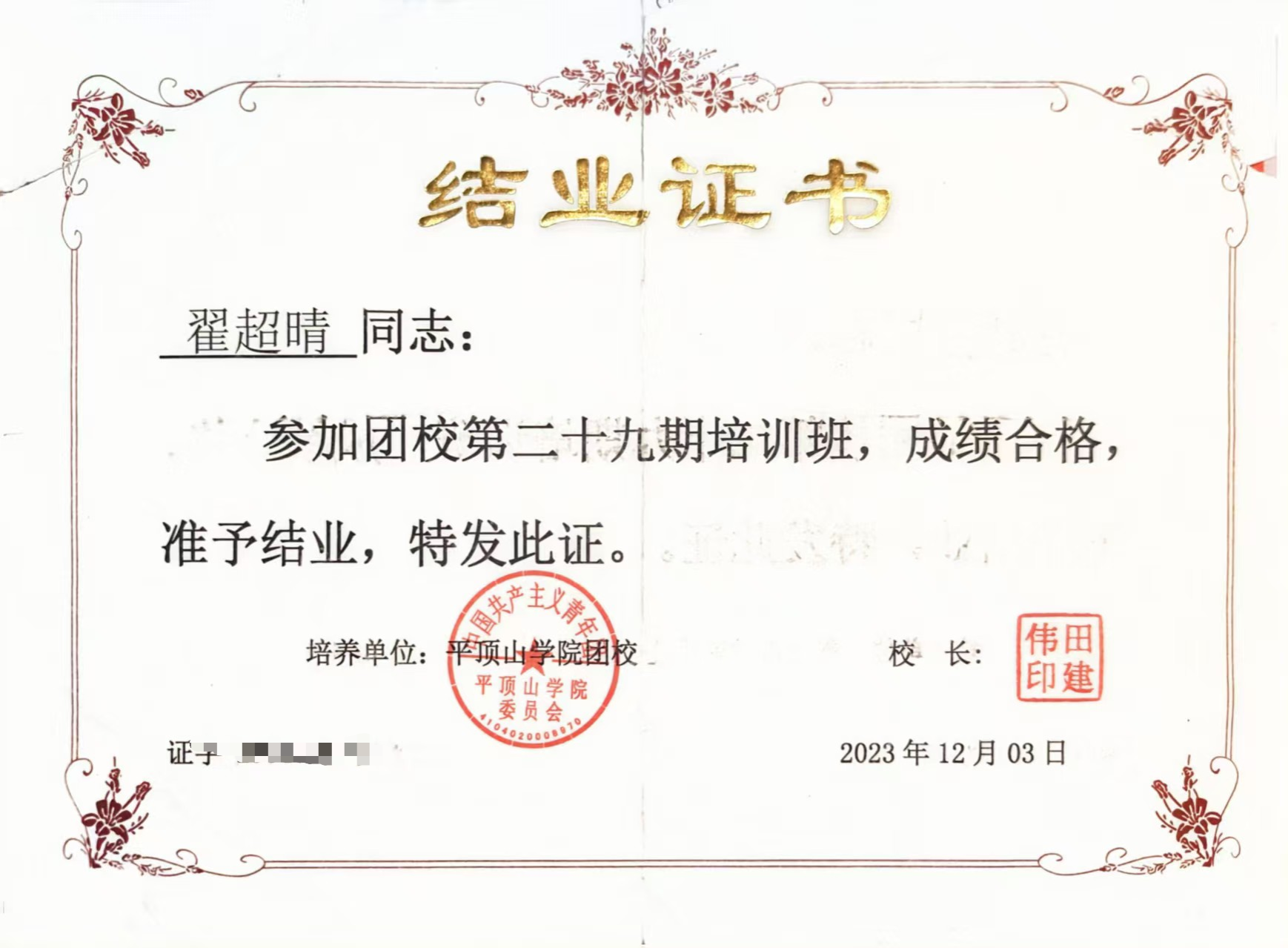 翟超晴始终锚定正确政治方向,以党员标准严以律己、主动向党组织靠拢,她深耕党的理论知识,系统研习方针政策,密切关注时政动态,先后参与团课培训、入党积极分子培训及青马培训并顺利结业,在理论学习中不断夯实思想根基、提升政治素养;日常里,她践行社会主义核心价值观,秉持诚信正直之态,主动关心集体、帮扶同学,以言行传递正向能量,稳步朝着“有理想、敢担当、能奉献”的目标迈进,让初心在点滴行动中愈发坚定。