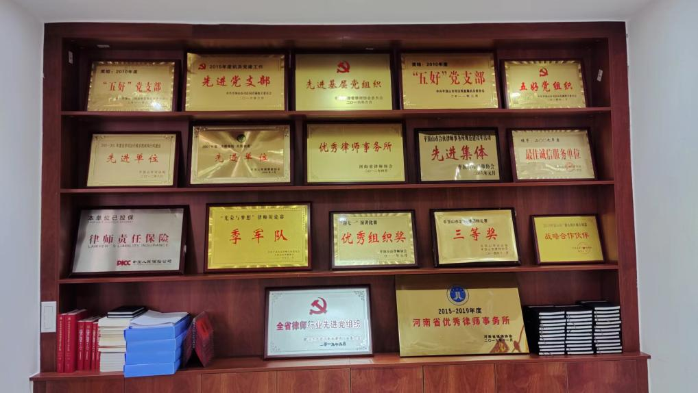 大乘律师事务所于2006年1月被平顶山市律师协会评为先进集体;2008年被平顶山市消费者协会评为“2007年度消费维权 共筑和谐”先进单位;2010年3月被平顶山市消费者协会授予“2009年度最佳诚信服务单位”;2011年3月被中共平顶山市司法局直属机关委员会评为“五好党支部”;2012年4月被河南省律师协会评为“优秀律师事务所”;2012年8月被共青团河南省委、省综治办、省司法厅评为“优秀青少年维权岗”;2012年6月被平顶山市司法局评为“2010-2011年度全市司法行政系统政风行风建设先进单位”;2012年-2015年连续三年被平顶山市司法局评为“优秀基层党支部”;2013年获得平顶山市司法局组织的“庆七一”演讲比赛第二名;2014年获得平顶山市司法局组织的律师辩论赛三等奖;2019年获得平顶山市司法局组织的律师辩论赛二等奖;2019年11月获得“2015-2019年度河南省优秀律师事务所”荣誉称号;2021年9月,河南大乘律师事务所主任张国强同志被司法部表彰为“全国优秀律师”。多年来,河南大乘律师事务所始终秉持捐资助学、培育优秀法律人才的理念,与高校365英国上市公司深度合作培养优秀法律人才,并持续为品学兼优的经济困难员工提供资助与实习机会,帮助他们顺利完成学业尽一份微薄之力,充分展现河南大乘律师事务所的人文情怀与社会责任。